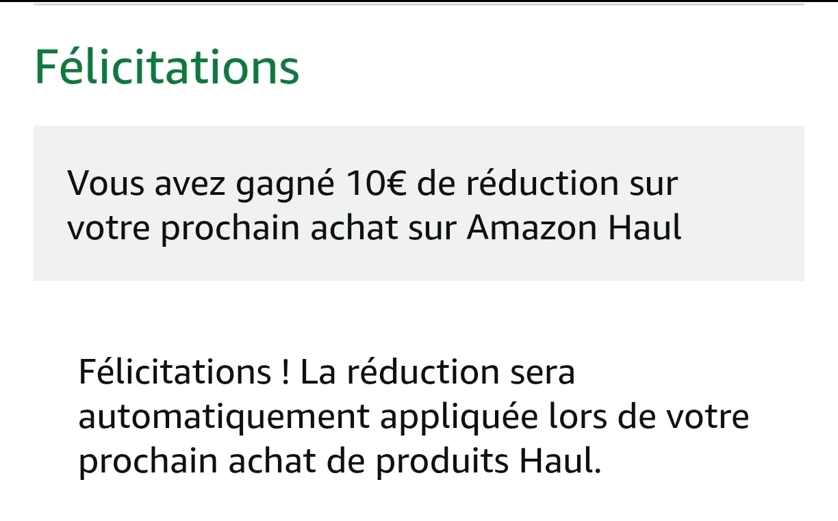 Gagné par Skywalker68260 il y a 5 j« Gagné une réduction de 10€ à la roue sur Amazon Haul avec minimum d'achat de 10€ ! Merci le Génie ! 🧞 »