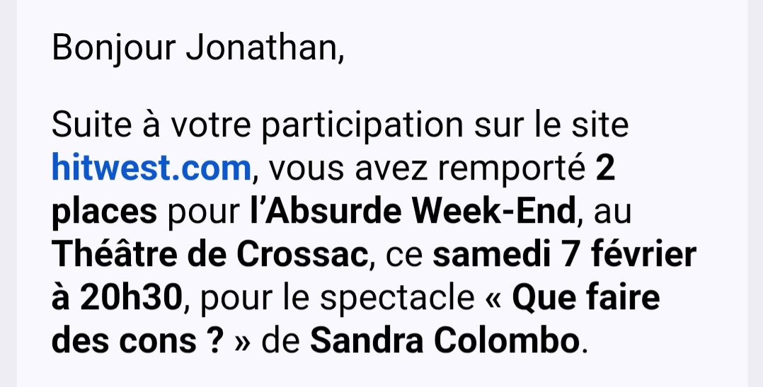 « Gagné aujourd'hui 2 places de spectacle avec Hit West trop content