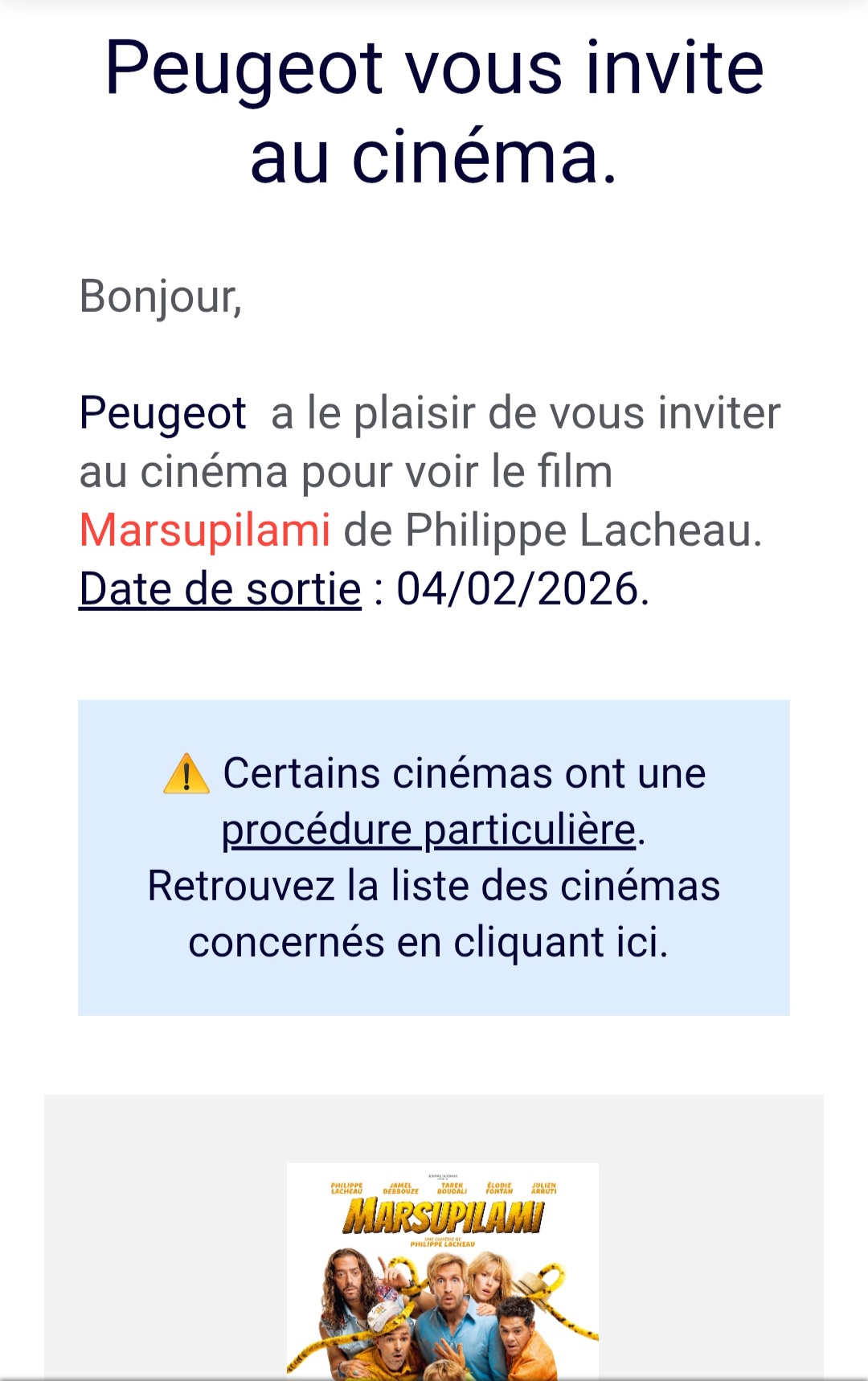« Gagné 2 places de cinéma avec Peugeot pour aller voir "Marsupilami", cool! Merci à Peugeot et au génie! »