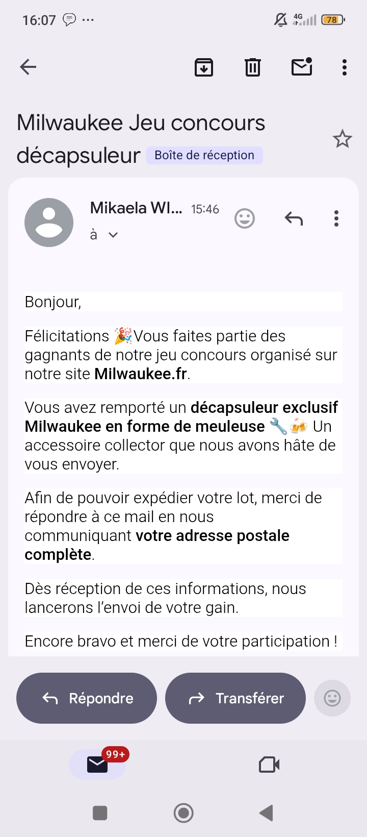 « Gagné avec la poste mobile sur instagram »