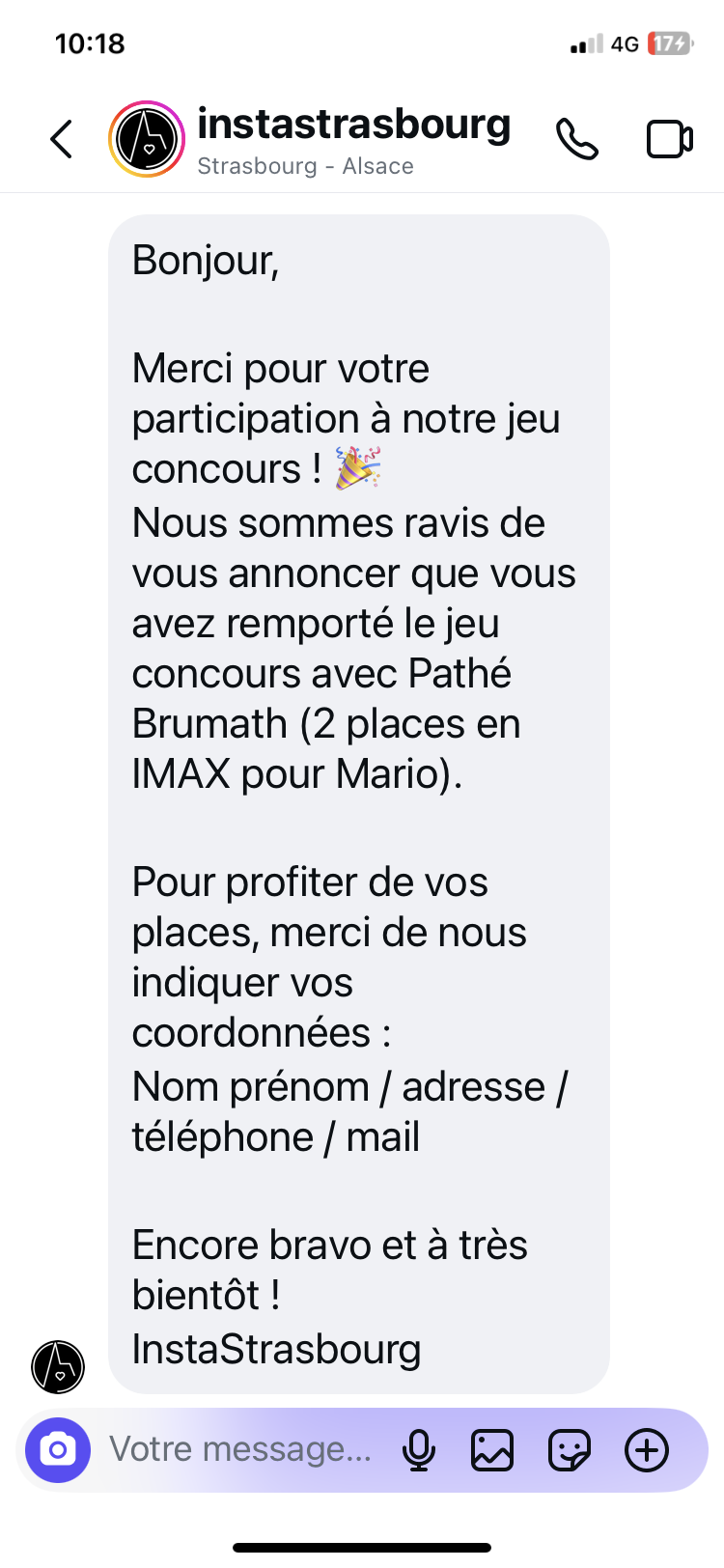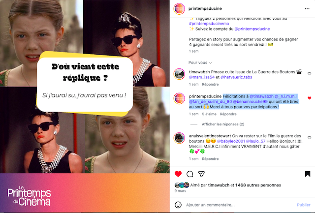 « Sur la page Instagram du Printemps du Cinéma, j'ai eu la joie, l'honneur et le privilège de voir mon pseudo parmi les vainqueurs.
