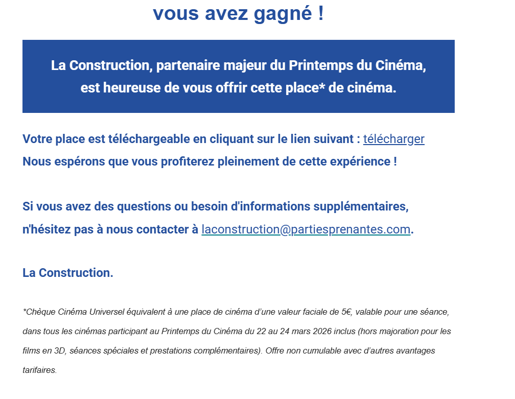 « Gagné au jeu Ccca-btp une place de ciné valable pour le printemps du cinéma ! Merci concours biz! »