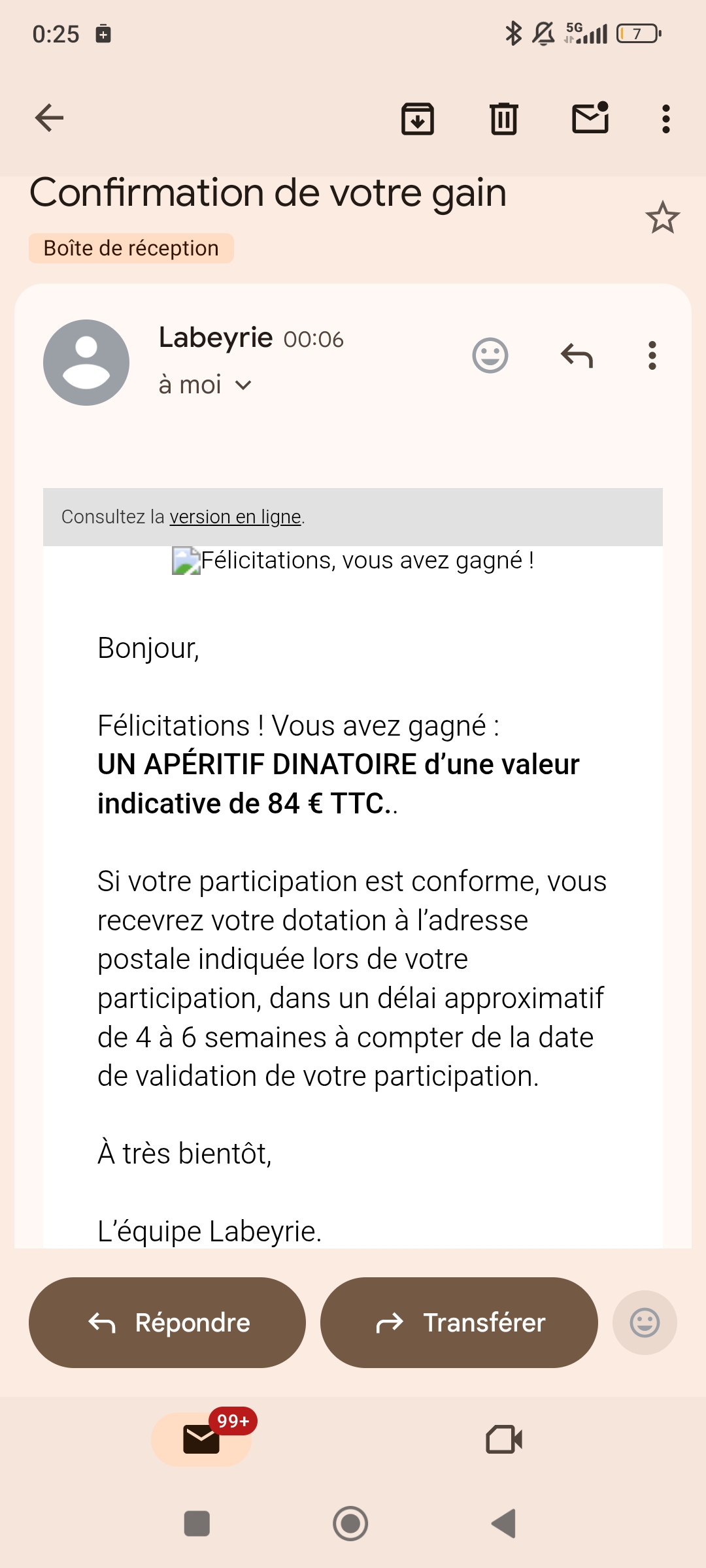 J'ai gagné un apéritif dinatoire Labeyrie d une valeur de 84 €.