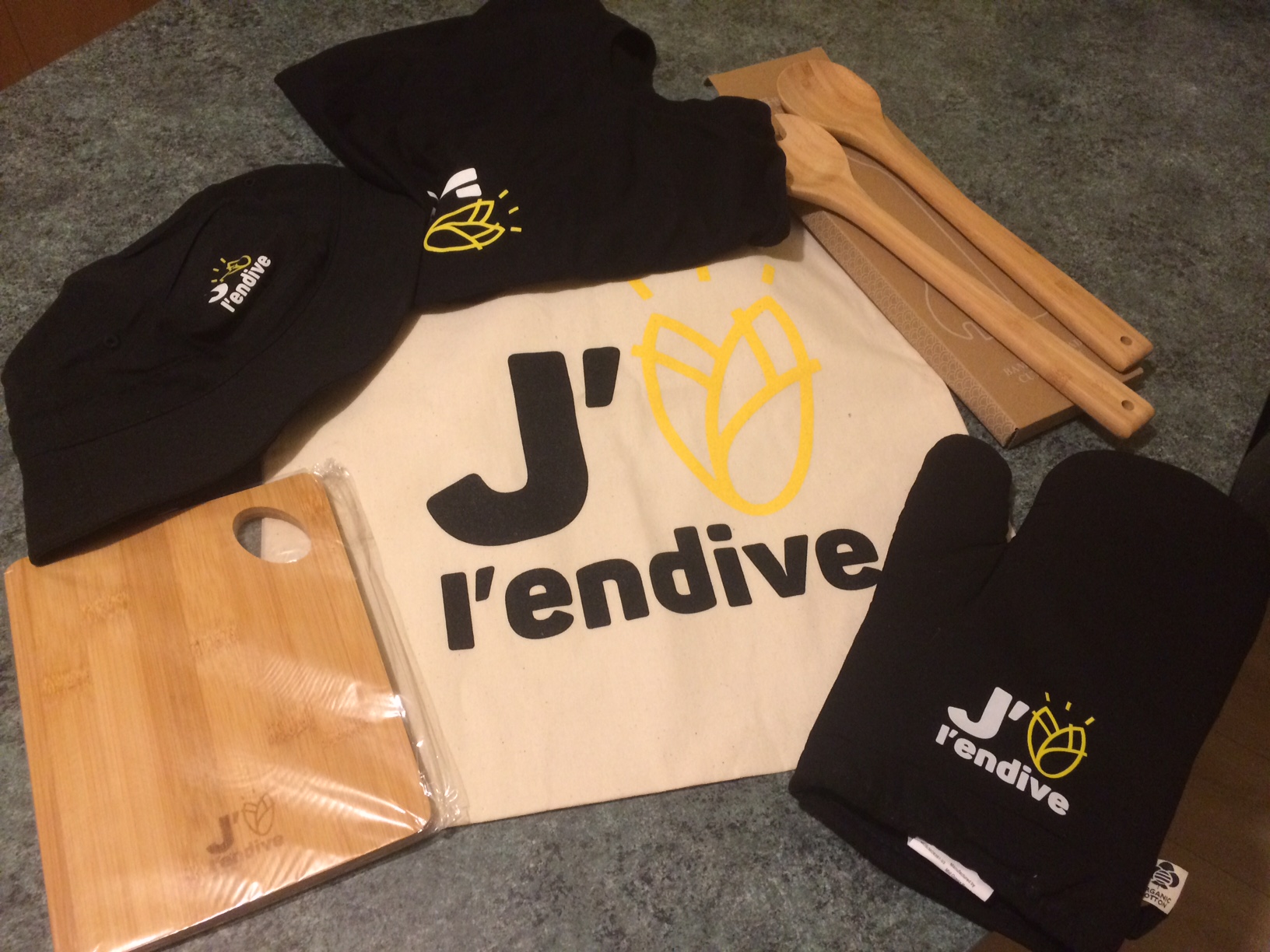 La box est composée d'1 t-shirt, 1 bob, 1 manique, 1 planche en bois, 1 set de couvert à salade et 1 tote bag 'J'aime l'endive". »