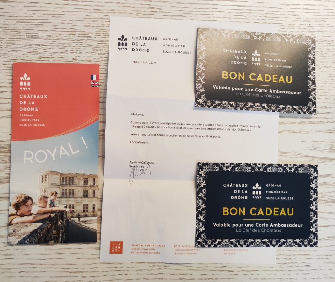 « Gagné au calendrier de l'avent avec Drôme Tourisme sur Facebook deux bons cadeaux valable pour une carte ambassadeur clefs des Châteaux. Les avantages sont un accès illimité et gratuit pour visiter les châteaux de la Drôme pendant un an, ainsi que des avantages et privilèges pour mes proches. »