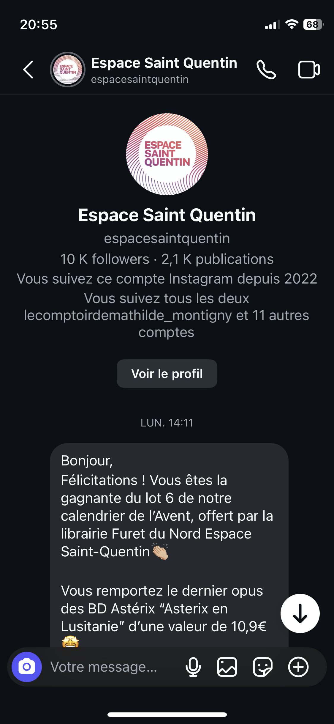 « 1er gain calendrier de l’avent via le compte insta du centre commercial SQY ouest et le furet du nord.