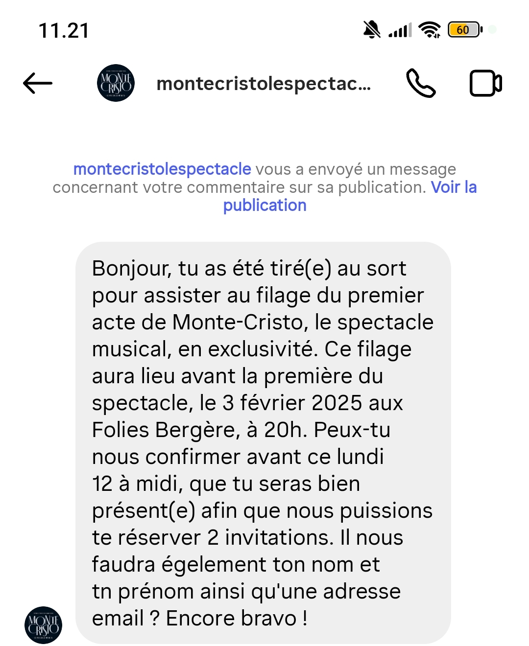 « 2 places pour voir le filage du premier acte de la comédie musicale "Le comte de Monte Cristo". Trop contente, je n'ai encore jamais assisté à un filage ! »