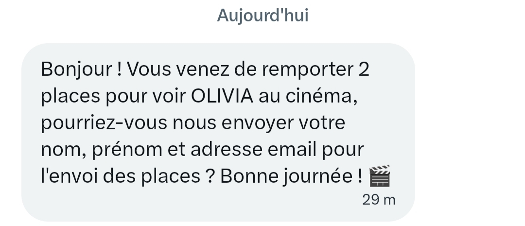 Cadeau gagné : 2 places de cinéma pour voir Olivia
