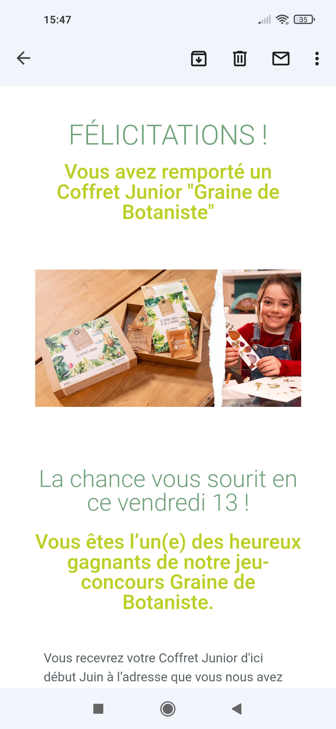 « Reçu ce matin cette belle petite boîte des émotions, mon fils adore merci beaucoup génie et bien sur à Bayard, pour ce magnifique lot. »
