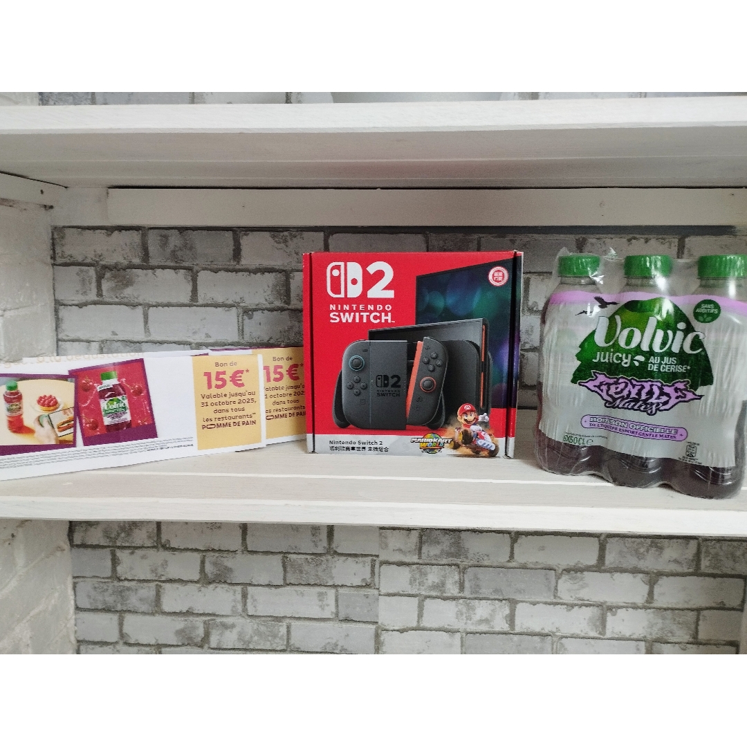 « 1 coffret Nintendo Switch 2 Mario Kart World, 2 BA de 15€ et 1 pack Volvic Juicy Cerise