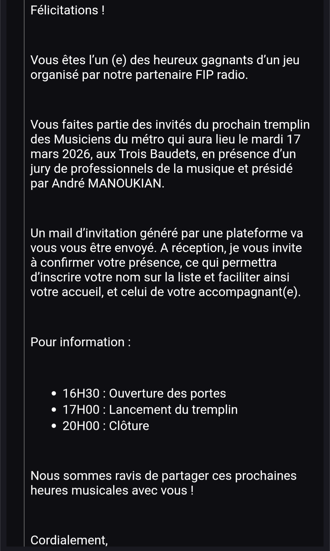 Cadeau gagné : Relance - Je propose 1 place pour le Tremplin des musiciens du Métro - Paris 17 mars