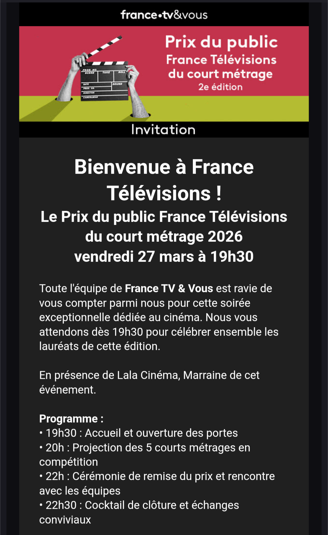 Cadeau gagné : 2 invitations pour le Prix du public France Télévisions du court métrage 2026