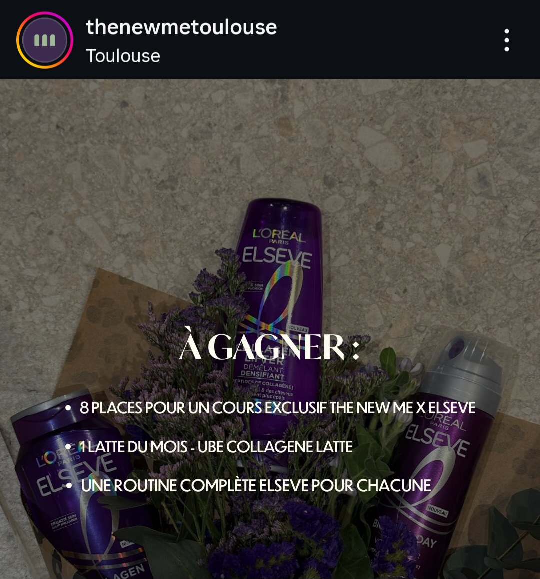 « Gagné sur TheNewMeToulouse (instagram) une session pilates reformer de 50min, une boisson au collagène et la nouvelle gamme de produits Elseve Collagen shampoing soin ect... avec un tote bag, un tee shirt et une gourde cadeau. C'était super, merci ! »