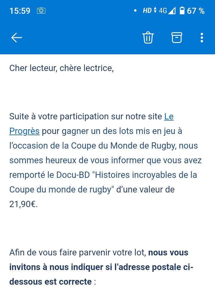Gagné par Marty Mcfly il y a 2 ans« Confirmation par mail ce jour aux instants gagnants de la docu-BD "Histoires incroyables de la Coupe du monde de rugby". Merci au Progrès et surtout au Génie ! »