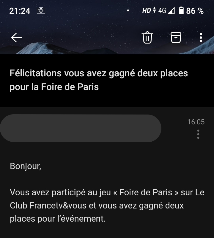 Gagné par Marty Mcfly il y a 1 an« Reçu le mail de confirmation ce jour, gagné deux places pour la Foire de Paris. Allez on emmène la p'tite famille ! Merci à France TV et au Génie !! »