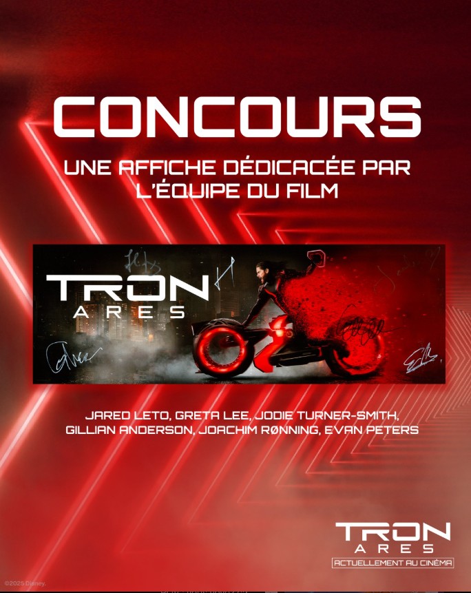Félicitations, vous êtes le gagnant de notre concours affiche Tron : Ares ! Vous remportez l'affiche dédicacée par l'équipe du film.
