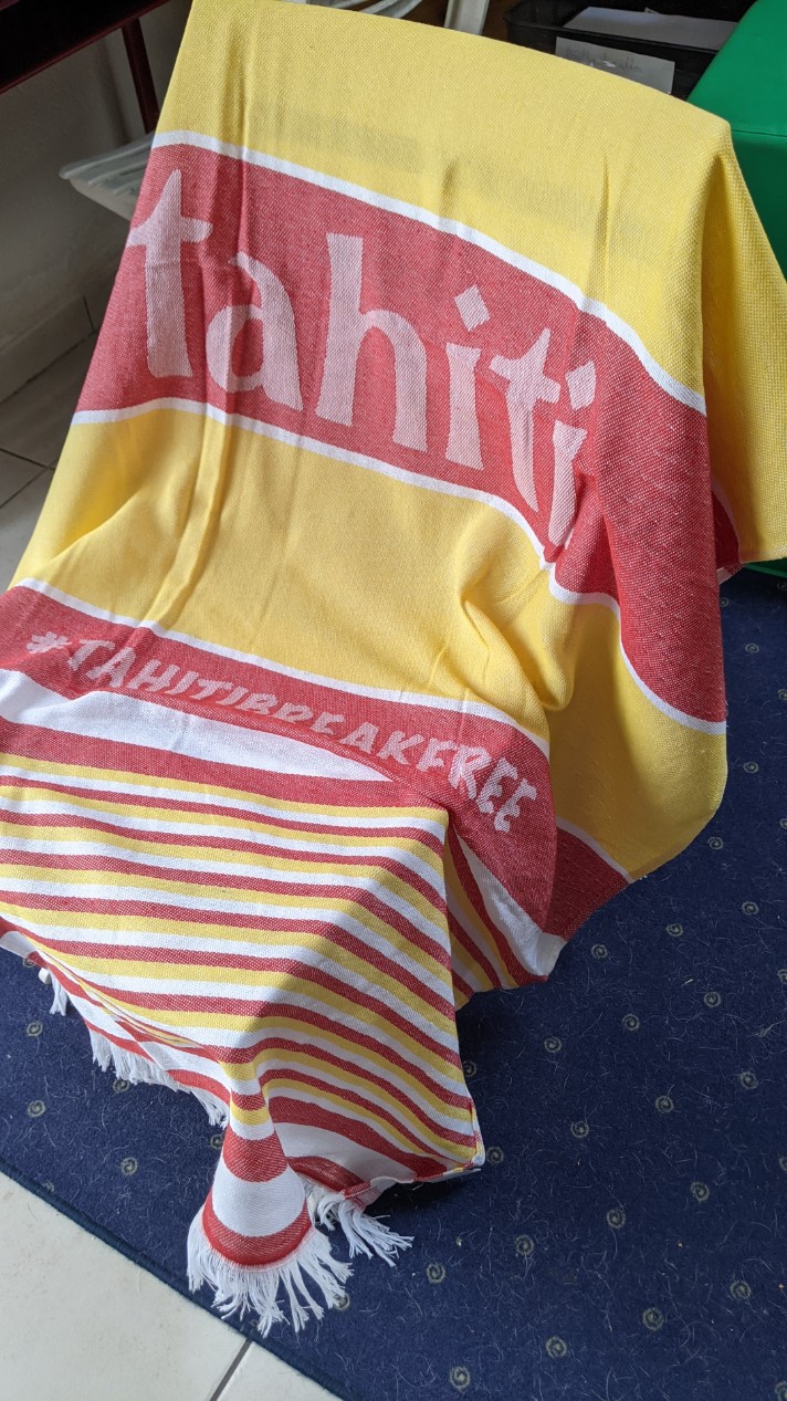 « Merci Génie, aujourd'hui reçu ce beau plaid Tahiti, gagné à un instant gagnant suite à obligation d'achat. Merci Tahiti. »