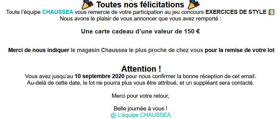 « Reçu aujourd'hui un mail m'annonçant avoir gagné une carte cadeau d'une valeur de 150 euros à dépenser dans les magasins Chausséa. Je désespérais depuis quelques semaines ... Merci génie! »