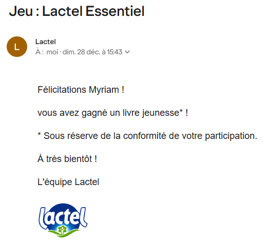 - Un livre jeunesse au jeu Lactel qui devrait arriver 8 semaine après la clôture du jeu . ma fille sera contente . Merci a notre génie d'amour »