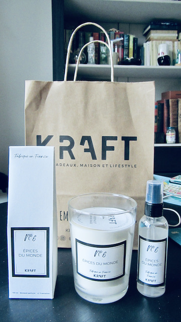 Je suis allée chercher ce lot hier dans la boutique Kraft du centre, lot qui est constitué d'une bougie, d'une brume parfumée et d'un bouquet d'intérieur avec ses tiges de bambou pour diffuser un parfum discret dans la maison. »