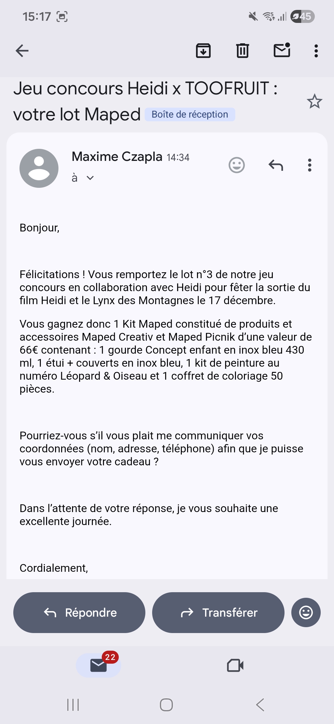 « J'ai remporté : 1 Kit Maped constitué de produits et accessoires Maped Creativ et Maped Picnik d’une valeur de 66€ contenant : 1 gourde Concept enfant en inox bleu 430 ml, 1 étui + couverts en inox bleu, 1 kit de peinture au numéro Léopard & Oiseau et 1 coffret de coloriage 50 pièces.