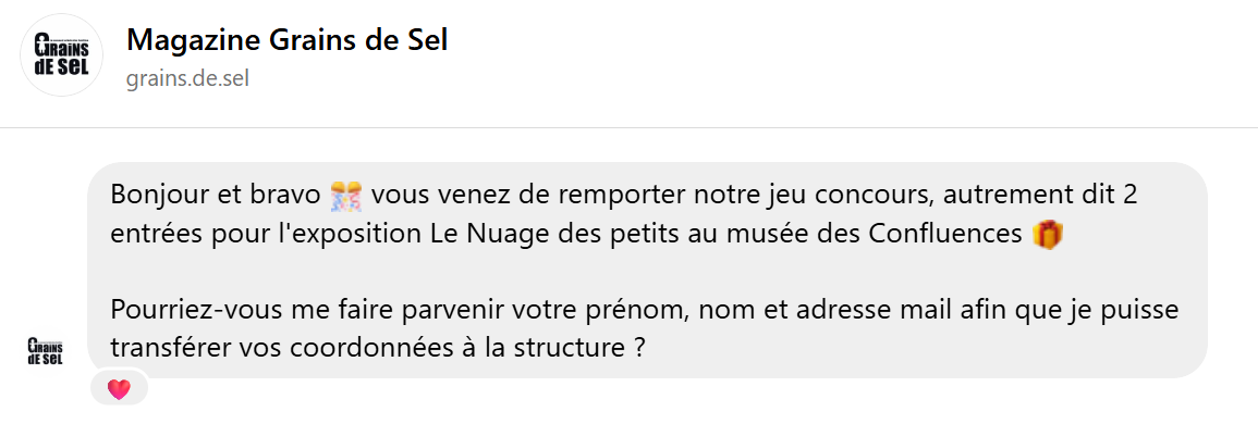 « Trop contente ! Gagné sur Instagram 2 entrées pour une exposition réservée aux enfants, avec des ateliers découvertes. Merci le Magazine Grains de Sel, le musée des confluences et le génie ! »