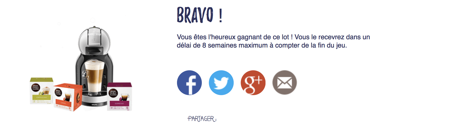 « Comme beaucoup, j'ai gagné la cafetière Dolce Gusto, je suis vraiment très heureuse, ne perdez pas espoir et continuer chaque jour ! Merci beaucoup au génie et au calendrier de l'avent croquons la vie