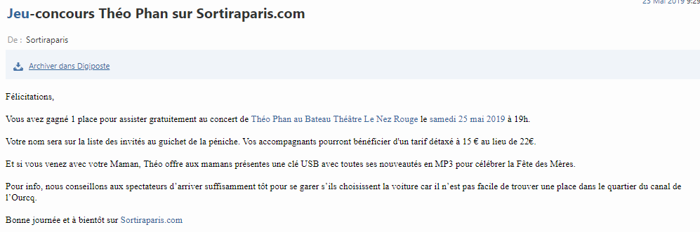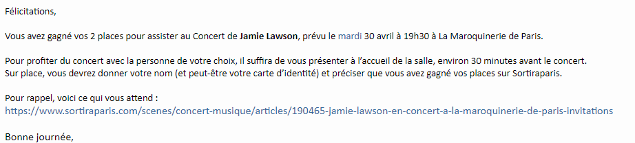 Vous recevrez alors vos 2 places pour assister au spectacle. »