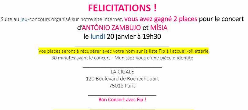 Suite à votre inscription sur le site de Rire & Chansons, nous avons le plaisir de vous annoncer que votre nom a été tiré au sort.