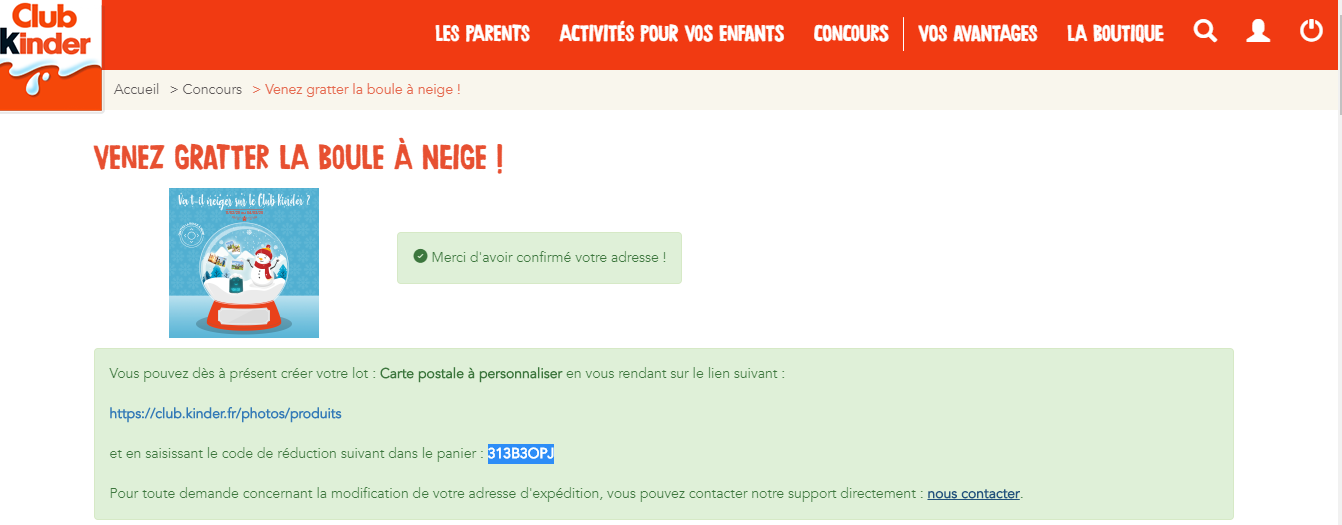« Instants gagnants de Kinder, gagné une carte postale à personnaliser.