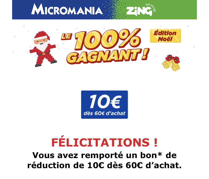 Cadeau gagné : Un bon de 10€ à partir de 60€ d’achat sur Micromania