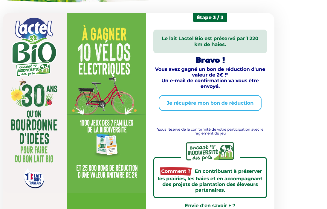 « Félicitations, vous avez gagné un bon de réduction d'une valeur de 2€ via le Jeu : 30 ans Lactel Bio »