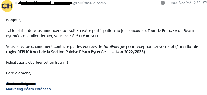 « Mail reçu confirmant mon gain : 1 maillot de rugby REPLICA vert de la Section Paloise Béarn Pyrénées – saison 2022/2023