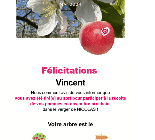 « Voici le message recu de Pink Lady : "vous avez été tiré au sort pour participer à la récolte de vos pommes en novembre prochain dans le verger de NICOLAS" »